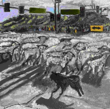 24a Peggy_Akovenko_Sheep Crossing~Eagle,Idaho~Beacon Light and Highway 55